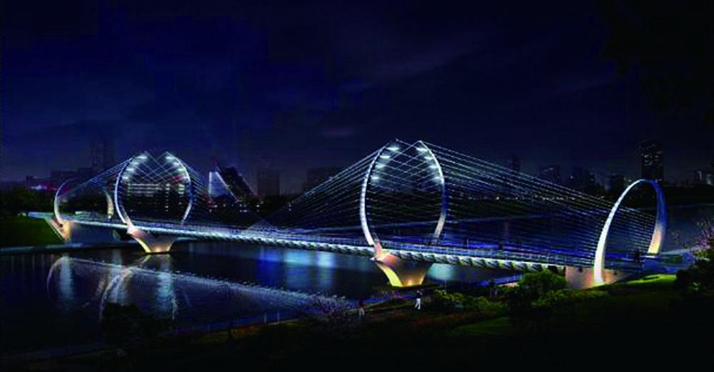 桥梁总长85米,全桥宽20米,16米车行道。主桥为三跨等截面预应力混凝土连续箱梁。桥墩采用钢筋混凝士变截面Y型墩,桥上设置装饰结构增强桥梁的美观性。净高大于3.5米满足通航要求。